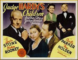Andy Hardy Banca o Sherlock / Judge Hardy and Son / 1939, com argumento e roteiro de Carey Wilson e direção de George Seitz, tinha Andy tentando ganhar um primeiro prêmio de 50 dólares num concurso de redação. Entretanto ele magnanimamente permite que uma jovem ganhe com a sua redação. A mãe desta moça está sendo procurada pelo Juiz Hardy para ajudar seus pais indigentes (Maria Ouspenskaya, Egon Bracher) a quem ela havia abandonado ao fazer um casamento por dinheiro. Mrs. Hardy se recupera de uma doença quase fatal.