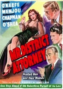MR. DISTRICT ATTORNEY – O promotor público Tom F. Winton, “campeão do povo”, defensor da verdade…guardião dos nossos direitos fundamentais à vida, liberdade e à felicidade, tal como era anunciado no programa de rádio de 1939, no qual nasceu, criado por Phillips H. Lord e com a voz de Dwight West, chegou ao cinema em 1941 numa série de três filmes da Republic. Cada filme tinha um ator diferente (Stanley Ridges, Paul Harvey, Lloyd Corrigan). O promotor tinha um assistente de nome curioso, P. Cadwallader Jones, representado na tela sucessivamente por Dennis O’ Keefe, James Ellison e John Hubbard. Em 1947, o personagem foi revivido como Maurice Vaughn num filme da Columbia sob os traços de Adolphe Menjou, tendo sido mudado também o nome de seu assistente para Steve Bennett, interpretado por Dennis O’Keefe.