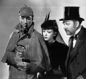 SHERLOCK HOLMES – Sem dúvida o mais famoso detetive de todos os tempos, criação imortal de Arthur Conan Doyle, o personagem apareceu no cinema inúmeras vezes desde 1903 e continua fornecendo assunto para filmes das mais variadas nacionalidades. As versões americanas mais conhecidas são Sherlock Holmes / Sherlock Holmes / 1922 com John Barrymore e Sherlock Holmes / Sherlock Holmes / 1932 com Clive Brook. A série é a iniciada pela 20thCentury-Fox em 1939 e que prosseguiu na Universal, mantendo-se os dois principais intérpretes, Basil Rathbone e Nigel Bruce este, como o Dr. Watson, o também célebre auxiliar, amigo e memorialista do grande investigador de Baker Street. Os dois filmes da Fox passavam-se na época Vitoriana, procurando recriar com fidelidade o ambiente dos romances de Doyle enquanto que, nos doze filmes da Universal, houve uma atualização para os anos quarenta, alguns servindo à propaganda anti-nazista. Rathbone e Bruce ainda representaram Sherlock e Watson como convidados especiais em uma comédia da dupla Ole Olse e Chic Johnson intitulada Casa de Loucos / Crazy House / 1943. No rádio, o programa baseado nas histórias de Conan Doyle entrou no ar em 1930 com as vozes de Richard Gordon e Leigh Lovel e depois Rathbone e Bruce, entre outros, sucederam-lhes como Sherlock Holmes e Dr. Watson. Por curiosidade, um dos muitos redatores do programa de rádio era Leslie Charteris, o autor de O Santo, escrevendo sob pseudônimo.