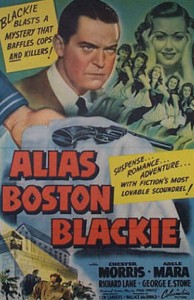 BOSTON BLACKIE – O ladrão de jóias que virou detetive amador está sempre às voltas com o Inspetor Farraday (Richard Lane) e acompanhado de seu melhor amigo “The Runt” (George E. Stone) e de um ricaço, Arthur Manleder (Lloyd Corrigan), disposto a ajudá-lo. O personagem criado em 1910 por Jack Boyle estreou no cinema mudo interpretado por Bert Lytell em dois filmes (A CENTELHA DO BEM / Boston Blackie’s Little Pal / 1918, REDENÇÃO / Blackie’s Redemption / 1919) e depois por vários outros atores – Sam de Grasse (LADRÃO DE LUVA DE PELICA / The Silk-Lined Burglar / 1919, David Powell (DIGNA DO MEU AMOR / Missing Millions / 1922), Lionel Barrymore (VOLÚPIA E OURO / The Face in the Fog / 1922), William Russell (O SUPLÍCIO DA ÁGUA / Boston Blackie / 1923), Thomas Carrigan (CAMINHOS TORTUOSOS / Crooked Alley / 1923), Forrest Stanley (OS TRÊS APACHES / Through the Dark / 1924), Raymond Glenn (A VITÓRIA DO BEM / The Return of Boston Blackie / 1927). Retomado pela Columbia em 1941, surgiram 14 filmes todos estrelados por Chester Morris, também o primeiro intérprete do programa de rádio iniciado em 1944, em cuja abertura o locutor exclamava: “Boston Blackie! Inimigo dos que fazem dele um inimigo; amigo dos que não têm amigos!”.