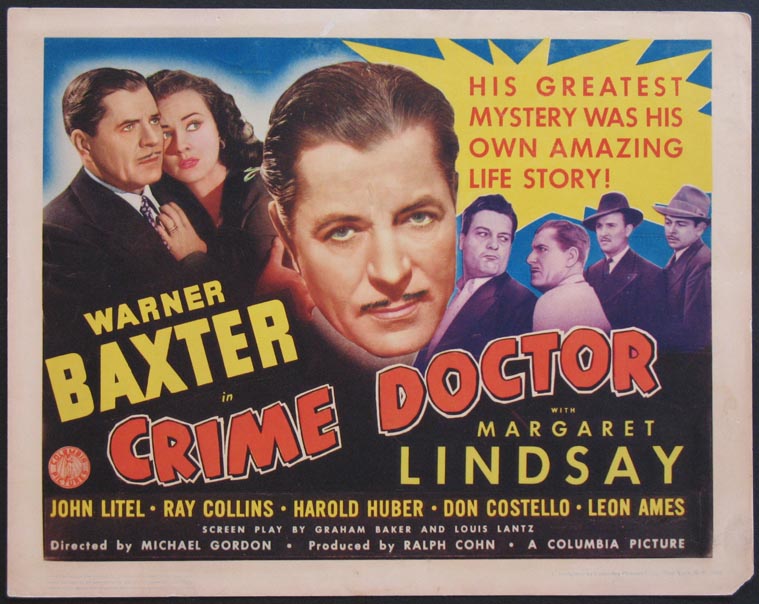 CRIME DOCTOR – O personagem do Dr. Robert Ordway, ex-gângster que se tornou psiquiatra, infalível solucionador de casos policiais, nasceu no programa de rádio de 1940, escrito por Max Marcin, interpretado inicialmente por Ray Collins e com o prenome de Benjamin. Quase no fim de cada episódio, o locutor dizia: “O Dr. Ordway voltará exatamente daquí a 57 segundos com a solução para o caso desta noite”. A Columbia aproveitou o Dr. Ordway numa série de dez filmes com Warner Baxter, eliminando as figuras do Inspetor Ross (Walter Greaza) e do Promotor Miller (Edgar Stehli), presentes na emissão radiofônica.