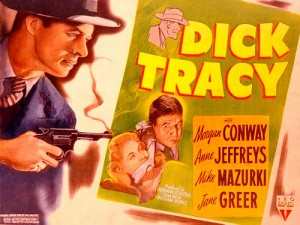 DICK TRACY – Criado nos quadrinhos em 1931 por Chester Gould, com os mais incríveis e estranhos bandidos, o famoso detetive de rosto quadrado surgiu na tela primeiramente num quarteto de seriados da Republic – Dick Tracy, o Detetive / Dick Tracy / 1937, A Volta de Dick Tracy / Dick Tracy Returns / 1938, Novas Aventuras de Dick Tracy / Dick Tracy’s G-Men, Dick Tracy contra o Crime / Dick Tracy vs. Crime Inc. / 1941 -, interpretados por Ralph Byrd. Depois é que veio a série de quatro filmes da RKO com Morgan Conway nos dois primeiros e Byrd nos restantes, aproveitando mais os tipos grotescos dos vilões dos comics como Gruesome (Boris Karloff), Cuesome (Dick Wessell), Splitface (Mike Mazurki), etc. O programa de rádio começou em 1940 com Ned Wever emprestando a voz para Tracy. Na apresentação, o locutor dizia: “E agora…Dick Tracy!” A seguir ouvia-se o som dos sinais dde código da radiopatrulha e Tracy falava: “Aqui é Dick Tracy no caso de …Preparem-se para agir” Entrava então o ruído dos carros arrancando e o barulho das sirenes e novamente a voz de Tracy: “Vamos, homens!”, após a qual vinha a do anunciante: “Sim, é Dick Tracy. Protetor da lei e da Ordem.”