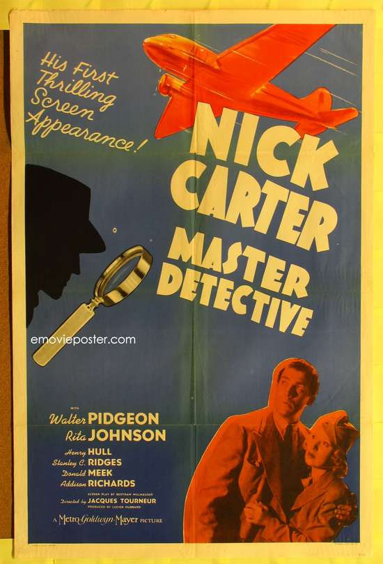 NICK CARTER – Inventadas por John R. Coryell em 1884, as aventuras do detetive foram depois continuadas por Frederick Van Rensselaer e outros autores. O personagem surgiu no cinema francês em 1908 na série da Éclair, Nick Carter, le Roi des Detectives, dirigida por Victorin Jasset.. No final dos anos 30, a MGM anunciou que havia comprado os direitos das histórias de Nick Carter para usá-las em filmes; porém, quando a série de três filmes começou a ser produzida em1939, todos eles foram baseados em argumentos originais. Walter Pidgeon fazia o papel do detetive e Donald Meek o do seu assistente Bartholomew, tímido e gentil criador de abelhas, espécie de Dr. Watson, injetando humor e humanidade nos espetáculos. Em 1943, o Nick Carter foi para o rádio com a voz de Lon Clark.