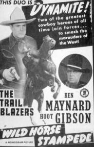 Ele ficou ausente das telas por quase seis anos, antes de retornar ao lado de Ken Maynard na série Trail Blazers, produzida a partir de 1943 por Robert Tansey em associação com a Monogram. Os dois veteranos receberam por filme quantia que, décadas antes, considerariam irrisória. Os filmes da série foram: O Mistério do Desfiladeiro / Wild Horse Stampede / 1943, Nas Malhas da Lei / The Law Rides Again / 1943, Pistolas Chamejantes / Blazing Guns / 1943, Vale da Morte / Death Valley Rangers / 1943, Rumo ao Oeste / Westward Bound / 1944, Falsários do Oeste / Arizona Whirlwind / 1944, Malfeitores / Outlaw Trail / 1944, Diligência de Sonora / Sonora Stagecoach / 1944, O Valentão de Utah / The Utah Kid / 1944, Paragens Inóspitas / Marked Trails / 1944, A Lei da Pistola / Trigger Law / 1944. A série começou com a trinca Hoot Gibson – Ken Maynard – Bob Baker. O papel de Baker era muito fraco e ele não voltou no segundo filme. No quarto filme entrou Bob Steele para formar novamente um trio. Maynard abandonou a série após o sexto filme e Steele e Gibson continuaram, apoiados em dois filmes por Chief Thunder Cloud. Tansey deixou de ser o produtor depois do oitavo filme, de modo que os três últimos na verdade não pertencem a série Trail Blazers.