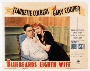 O último filme de Lubitsch na Paramount foi A Oitava Esposa do Barba-Azul / Bluebeard’s Eighth Wife / 1938, comédia-farsa escrita por Billy Wilder e Charles Brackett com base na peça La Huitième Femme de Barbe Bleu de Alfred Savoir. Focaliza Nicole de Loiselle (Claudette Colbert), filha de um nobre francês arruinado, o Marquês de Loiselle (Edward Everett Horton), que se torna a oitava esposa do milionário americano Michael Brandon (Gary Cooper); mas, para lhe ensinar lições de refinamento, ela adia a consumação do matrimônio.