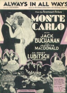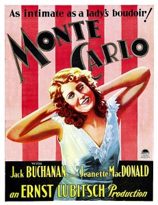 Reunindo uma obscura peça alemã, Die Blaue Küste de Hans Müller com episódios de Monsieur Beaucaire de Booth Tarkington e Evelyn Greenleaf Sutherland, o roteirista Ernest Vajda escreveu Monte Carlo / Monte Carlo / 1930, outra opereta. Aperfeiçoando sua fórmula, Lubitsch demonstrou ainda melhor controle na integração das canções às imagens. “Cada canção esboça o personagem ou faz avançar a intriga: as canções não surgem apenas naturalmente da ação, ela são a ação”(Scott Eyman).