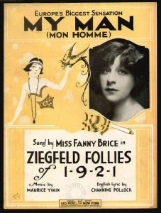 FANNY BRICE (Fannie Borach, 1891-1951). Fanny ficava sempre à vontade tanto interpretando canções cômicas como letras de música trágicas. Ela era uma grande cantora de fossa, como ficou evidenciado na interpretação de sua canção mais famosa, “My Man”. Magra e comprida, com olhos em forma de meia lua e um nariz de papagaio, sorriso largo e forte sotaque yddish, a popular artista era muito engraçada, principalmente quando compunha o tipo de uma vamp cinematográfica ou de uma madame da alta sociedade. Depois de se apresentar como amadora num teatro do Brooklyn, cantando – com lágrimas de emoção – “You Know You’re Not Forgotten by the Girl You Can’t Forget”, Fanny fez um teste com George M. Cohan mas foi reprovada porque não sabia dançar. Ela então excursionou com uma companhia de teatro burlesco, até ser vista por Florenz Ziegfeld, que estava escolhendo o elenco de sua Follies de 1910. Quando o espetáculo estreou no New York Theatre em 20 de junho de 1910, inquestionavelmente uma estrela acabara de nascer. Ziegfeld colocou Fanny como atração principal de sua Follies de 1911, 1916, 1917, 1920, 1921 e 1923 mas o célebre show man nunca lhe deu oportunidade de fazer outra coisa senão comédia. Depois ela foi estrela na “Music Box Revue”(1924-1925) e em peças da Broadway. Fanny se tornou uma favorita do público também no vaudeville. Ela estreou no Palace em fevereiro de 1914 e seria uma artista habitual no gênero pelos próximos vinte anos. Um primeiro casamento, quando ela era ainda adolescente com Grant White logo se dissolveu tal como seu segundo matrimônio, em 1918, com o jogador Nick Arnstein (que inspirou a canção “My Man”).