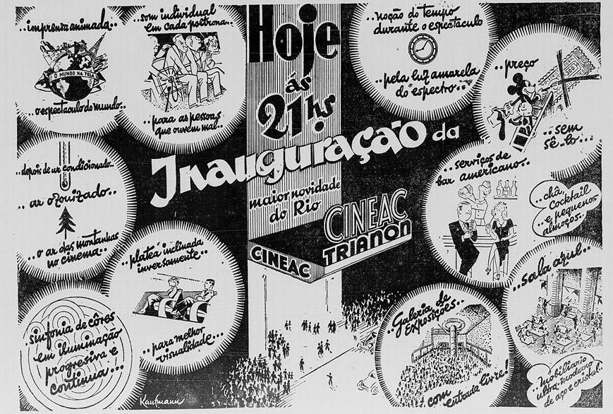 “O Cineac Trianon, o super-cinema da avenida, que vai dar a nota elegante do centro da cidade, tanto pela sua esplêndida instalação como pelo constante interesse do novo gênero cinematográfico que apresenta é, sobretudo, uma casa do mais requintado bom gosto – distinta, moderna e original. Desde a entrada, o Cineac Trianon diferencia-se de quanto existe em nossa cidade, mesmo dos cinemas recentemente construídos.