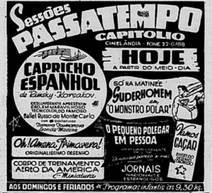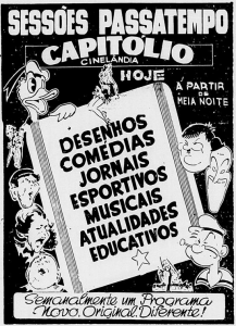 Em 31 de dezembro de 1943, em pré-estréia à meia-noite e depois regularmente à partir do dia 1 de janeiro de 1944, o Cinema Capitólio (ex-Cine Broadway reaberto com este nome em 28 de fevereiro de 1942) deu início às suas famosas “Sessões Passatempo”, proclamando que “O Espetáculo Começa Quando Você Chega”. A sessão começava ao meio-dia e aos domingos e feriados o cinema proporcionava “Programas Infantís” às 9.30hs. Em cima da tela havia um globo iluminado por uma luz azul, conforme me lembrou meu amigo José Mauricio Ferraz, e as atrações eram semelhantes às do Cineac Trianon.
