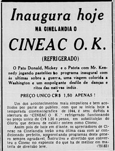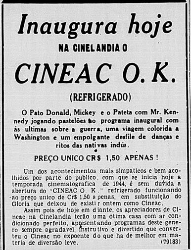 Em 1 de janeiro de 1944, surgiu o Cineac O.K. na rua Alcindo Guanabara n.17, subsolo, que esteve em atividade até 4 de outubro de 1945, com o mesmo programa do Trianon. Os jornais noticiaram: “Um dos acontecimentos mais simpáticos e bem acolhidos por parte do público, com que se inicia hoje a temporada cinematográfica de 1944, é sem dúvida a abertura do “Cineac O.K.” refrigerado, funcionando ao preço único de Cr$1.50 apenas, em substituição do Gloria, que deixou de existir ontem como Cineac. Assim pois, de hoje em diante, os apreciadores do Cineac na Cinelândia terão uma ótima casa com ar condicionado perfeito, apresentando programas deste gênero sempre agradável, instrutivo e divertido, que converteu o Cineac no expoente do que há de melhor em matéria de diversão leve”.
