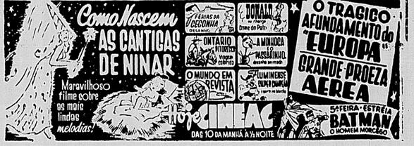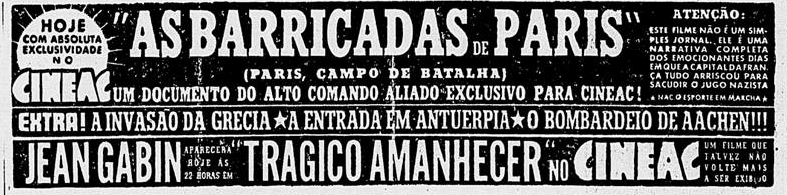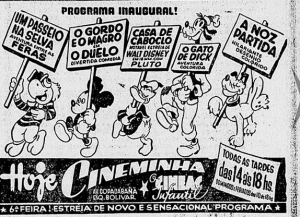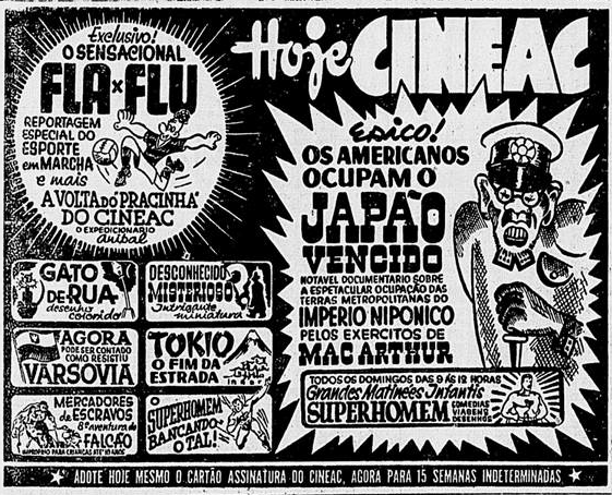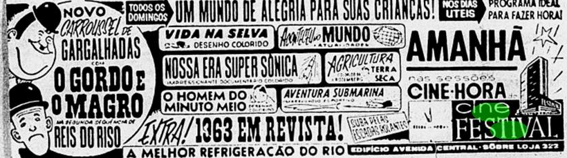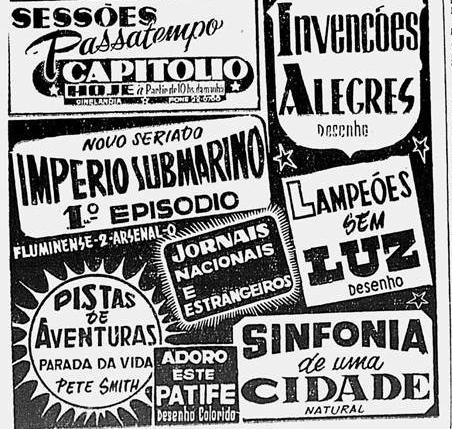 A partir daí sucederam-se cine-jornais (Imprensa Animada – editado pela agência francêsa Havas e ilustrado a partir de maio de 1942 por Luiz Sá), Notícias do Dia, O Esporte em Marcha, O Mundo em Revista, Atualidades UFA, Atualidades O Globo (da Cinédia), Atualidades RKO – Pathé, Paramount – RKO News, Olympic Jornal, Luce Jornal, Atualidades Francêsas etc.) com as notícias do mundo e principalmente da guerra e do pós guerra (vg. Devastação de Tóquio, O Suicídio de Himmler, Quisling Condenado à Morte, O Harakiri Coletivo de Iwo Jima, Os Americanos Ocupam o Japão Vencido, A Morte de Mussolini e Clara Petacci, O Inferno Atômico de Nagasaki, A Vida Íntima de Eva Braun, A Libertação de Paris etc.); cine-revistas como A Marcha do Tempo e Assim é a América; desenhos animados (Pato Donald, Mickey Mouse, Pluto, Pateta, Popeye, O Touro Ferdinando, Superhomem, Gato Felix, Tom e Jerry e inclusive desenhos de longa-metragem (Fantasia, Bambi) exibidos por partes; animação (Os Puppetoons de George Pal – aqui chamados de Bonecos Movíveis de Pal – com seu personagem principal Jasper, traduzido por Gasparim); shorts de várias espécies (Pete Smith, Retrorelâmpagos, Ainda que Pareça Incrível, Instantâneos de Hollywood, Ocupações Inusitadas, Ciência Popular, Tapete Mágico, Aventuras do Arco e Flexa com o arqueiro Howard Hill, Divertimentos Aquáticos, Ray Whitley e seus vaqueiros musicais etc.); comédias curtas (com Shirley Temple, Edgar Kennedy, Andy Clyde, Leon Errol, Billy Gilbert, Hugh Herbert, Wally Brown, Gil Lamb, O Gordo e o Magro, Buster Keaton, Harry Langdon, Vera Vague, Os Peraltas / Our Gang, Os Três Patetas, anunciados como “Os Campeões da Cretinice”, etc.); seriados (O Fantasma Voador, O Misterioso Dr. Satan, O Morcego, O Código Secreto, O Falcão do Deserto, Brenda Starr, Repórter etc.) e filmes em 16mm como Minha Vida no Sertão com o caçador Sacha Siemel.