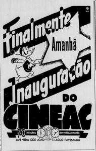 Em resumo: belo, moderno, extremamente confortável, dispondo de excelente refrigeração, o Cineac Trianon faz honra aos grandes progressos da nossa capital”.