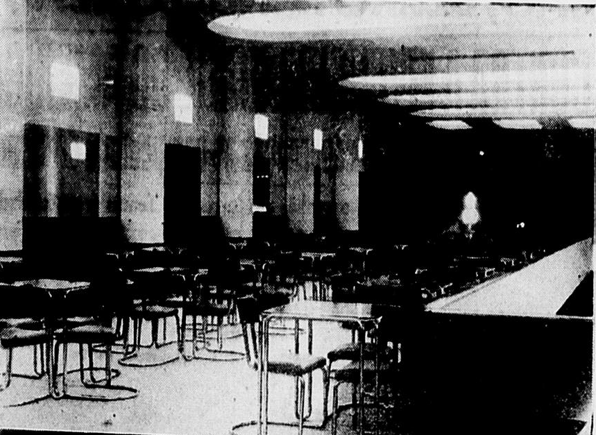 O teto do “hall” é todo iluminado por tubos de gás néon azul, em sancas, produzindo efeito de cor de gelo. O “hall” de entrada é inteiramente livre, ladeado por vitrines para exposição de objetos artísticos e outros finos artigos de comércio. O “hall” central é dividido ao meio por graciosas colunas revestidas de aço inoxidável, em espiral, e de um polido semelhante ao da prata nova.