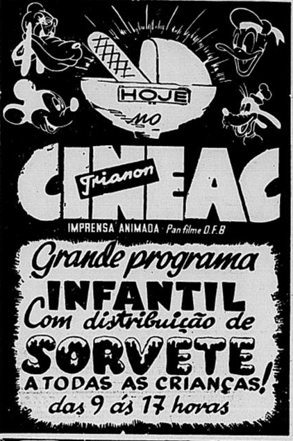 Do primeiro programa do Cineac Trianon, anunciado como “70 Minutos em Volta do Mundo”, constavam as seguintes atrações: Notícias do Rio – Atualidades UFA – Jóias Marinhas – Caçadores no Polo com o Pato Donald – Paramount News – A Marcha do Tempo – Imprensa Animada Cineac – O Moinho Velho, uma das novas 35 sinfonias coloridas de Walt Disney.