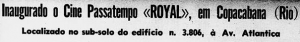 Em 15 de agosto de 1952, Livio Bruni inaugurou o Cine-Passatempo “Royal” na Avenida Atlântica 3806, subsolo da Galeria Alaska, com sessões diárias das 10hs às 24hs. As sessões passatempo no Cinema Royal persistiram até maio de 1956.