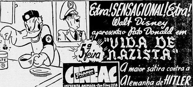 O estúdio Disney, com seus 1.200 empregados, foi o único classificado como fábrica de produção de guerra oficial pelo governo e, por causa disso, ficava cercado por sacos de areia e artilharia antiaérea. Durante a Segunda Guerra Mundial, 90% dos animadores realizaram centenas de fimes de treinamento e de informação e desenharam mais de mil insígnias militares, sendo que o Pato Donald figurou em mais de quatrocentas das mesmas. Em 1943, Disney fez The Spirit of 43, Vitória pela Fôrça Aérea / Victory Through Air Power (baseado no livro do major Alexander de Seversky sôbre o bombardeio estratégico de longo alcance, encaixando desenho e ação “ao vivo”), e dois especiais, Educação para a Morte / Education for Death -The Making of a Nazi e Razão e Emoção / Reason and Emotion. No mesmo ano, Vida de Nazista / Der Fuherer’s Face, desenho do Pato Donald satirizando o nazismo, obteve o Oscar da Academia. Nos outros desenhos, Disney também introduzia temas de propaganda , como em Donald é Sorteado / Donald Gets Drafted / 1942, A Mascote do Exército / The Army Mascot / 1942, O Soldado Invisível / The Vanishing Private / 1942, Aviador do Barulho / Sky Trooper / 1942, A Sentinela / Private Pluto / 1943,; O Automo … Bastão / Victory Vehicles / 1943, Pateta, o Marujo / How to be a Sailor / 1944, O Paraquedista / Commando Duck / 1944 etc.