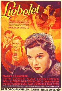 O último filme realizado por Ophüls na Alemanha, Uma História de Amor / Liebelei / 1933, adaptação (com algumas modificações da obra original, entre elas a exposição da futilidade e estupidez da mentalidade teutônica do “código de honra”) de uma peça de Arthur Schnitzler, é um melodrama romântico melancólico e cruel, pondo em cena dois tenentes da cavalaria do exército austríaco do imperador Francisco José, que encontram o amor com duas jovens simples e sinceras. Fritz Lobheimer (Wolfgang Liebeneiner) está vivendo um romance adulterino com a Baronesa Eggersdorff (Olga Tschechowa), mas se apaixona pela doce e pura, Christine Weiring (Magda Schneider), filha de um modesto músico de orquestra da Ópera, (Paul Hörbinger) enquanto seu colega Theo Berg (Willi Eichbwerger), namora Mizzi Schlager (Luise Ullrich), amiga de Christine. Quando o Barão (Gustaf Gründgens) descobre a traição da esposa, desafia Fritz para um duelo. O Barão é o primeiro a atirar e ele mata Fritz. Quando Christine é informada de sua morte, ela se joga de uma janela.