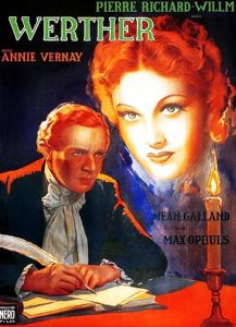 Le Roman de Werther / 1938 (Prod: Nero-Film (Seymour Nebenzal). Rot: Hans Wilhelm. Adapt: H. Wilhelm, M. Ophüls), baseado em “Leiden des jungen Werthers”, romance de Johan Wolfgang von Goethe), drama romântico sobre o amor impossível de Werther (Pierre Richard-Willm), jovem poeta e músico que chega em Walheim, na Alemanha, para assumir o posto de referendário no Palácio de Justiça local e Charlotte (Annie Vernay), que está prometida ao juiz Albert (Jean Galland), superior hierárquico de Werther. Quando Werther vem a saber disso, ele passa as noites no cabaré embriagando-se e se entrega a diversas extravagâncias, que suscitam a reprovação de Albert. Werther escreve uma carta para Charlotte, contendo um apelo desesperado. Em vez de responder, Charlotte vai se confessar (“Eu não mentí e não disse a verdade”, diz ela ao padre, referindo-se ao fato de não ter dito logo a Werther que estava noiva de Albert). Por ocasião de uma discussão profissional a respeito de um assassino que matou por amor, Albert, que desconfia de algo, ordena que Werther peça demissão. Uma noite, Werther vai para o lugar no campo em que ele encontrara Charlotte, e se mata com um tiro de pistola.