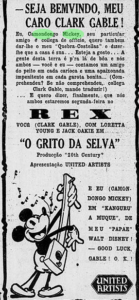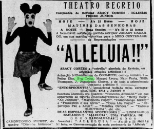 Termino com uma curiosidade: em abril de 1936, a companhia de revistas do Teatro Recreio apresentou “Aleluia” de Joracy Camargo – o conhecido autor de “Deus lhe Pague”, um dos maiores sucessos de Procópio Ferreira – , que apresentava um quadro intitulado “Desenhos Animados” com Aracy Côrtes como Betty Boop, Oscarito como o Marinheiro Popeye, Willy Thompson como Al Jolson, Janot e Lou como Frankenstein e sua noiva e Eva Todor (ainda bem mocinha) no papel do Camondongo Mickey.