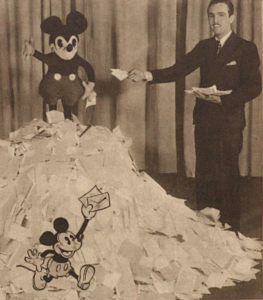 Personagem a partir do qual se construiu o mundo de sonho de Walt Disney e o seu império industrial, o “camondongo da fuzarca” é provavelmente a imagem mais difundida no mundo, transformando-se em um ícone universal. Embora atacado como símbolo do capitalismo americano, Mickey encantou e continua encantando pessoas de todas as nacionalidades com sua imagem doce e honesta e suas aventuras, primeiro transmitidas no cinema e depois transportadas para tiras de jornais, revistas de quadrinhos, livros infantis, televisão e outros meios de comunicação e diversão.