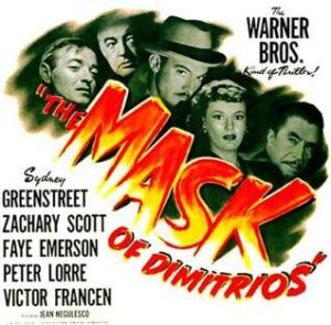 Baseado em um romance de Eric Ambler, A Máscara de Dimtrios é um drama criminal absorvente com um bom nível de suspense e originalidade. No enredo, o escritor de livros de mistério Cornelius Leyden (Peter Lorre) está viajando por Istanbul quando conhece o Coronel Haki (Kurt Katch), chefe da polícia secreta, que é um grande fã de seu trabalho. Através dele, Leyden fica sabendo que o corpo de um criminoso notório, Dimitrios Makroupolos (Zachary Scott), foi encontrado morto na praia. Parece que Makropoulos estava envolvido em toda espécie de atos ilegais imagináveis de homicídio, contrabando, chantagem a assassinato político. Fascinado, Leyden decide que Makroupolos seria um bom argumento para seu próximo livro e começa a pesquisar sobre sua vida, a partir do dossier de Haki sobre o criminoso. A investigação de Leyden o leva para muitos lugares da Europa, onde se encontra com várias pessoas que conheceram Makroupolos: Irana Prevaya (Faye Emerson), a mulher que ele amou; Grodek (Victor Francen), que ele enganou; Bulic (Steve Geray), que ele desonrou e Mr. Peters (Sidney Greenstreet), que foi sua vítima e não está convencido da morte do criminoso. Este retrato de um personagem misterioso tal como foi visto por diversas pessoas o faz aparecer sucessivamente sob aspectos bem diferentes e mantém um interesse constante pelo relato, conduzido com vigor pelo cineasta. que contou com um excelente roteiro de Frank Gruber, uma câmara inspirada de Arthur Edeson e um elenco admirável.