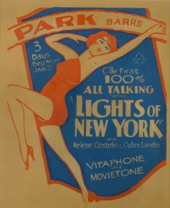 Tendo produzido o primeiro filme “parcialmente falado” (part talking) – O Cantor de Jazz -, a Warner continuou a mostrar o caminho, produzindo o primeiro filme “todo falado” (all talking) – Luzes de Nova York / Lights of New York / 1928 (Dir: Brian Foy) – drama criminal sobre dois barbeiros de uma cidade pequena que vão para Nova York e se envolvem com traficantes de bebidas. O enorme sucesso popular de Luzes de Nova York demonstrou que os filmes totalmente dialogados não só podiam ser feitos como também atraíam um grande público. De fato, os “talkies” agradaram muito e, no final de 1928, ficou claro que o cinema silencioso estava morto.