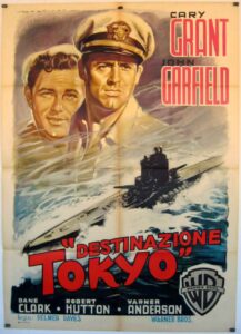 DESTINATION TOKYO / 1943. Rumo a Tóquio. Warner Bros. (Dir: Delmer Daves). Dirigindo-se primeiro às Ilhas Aleutas para pegar o meteorologista Tenente Raymond (John Ridgely), o submarino Copperfin, comandado pelo Capitão Cassidy (Cary Grant) entra na Baía de Tóquio, a fim de obter informação vital sobre o tempo para o próximo ataque aéreo de Doolittle sobre a capital japonêsa. Vários incidentes ocorrem: o primeiro mergulho cheio de suspense sob ameaça de ataque aéreo; o recolhimento a bordo do metereologista em um recanto aleutiano envôlto em névoa; o ataque (e destruição) de dois aviões inimigos; a bomba não detonada na superestrutura do submarino, que deve ser desativada manualmente; uma operação de apendicite de emergência realizada por amadores; o funeral no mar etc. Em uma das melhores cenas, um marujo tenta resgatar um piloto japonês cujo avião foi atingido. O piloto esfaqueia o marujo pelas costas e é metralhado.