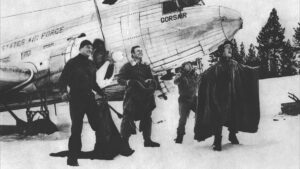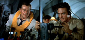 1953 – Geleiras do Inferno / Island in the Sky / Warner Bros. (aventura e suspense ocorrem nesta adaptação do livro escrito pelo autor de histórias de aviação Ernest K. Gann, quando um Corsair faz uma aterrissagem forçada em uma região inóspita e deserta no norte do Canadá. Enquanto a tripulação, comandada pelo Capitão Dooley (John Wayne), tenta sobreviver sob um frio terrível, com escassez de víveres e o um desespero crescente, organizam-se na Ilha de Presque no Maine os planos de salvamento. Direção sóbria e eficiente com boas sequências (fotografadas pelo competente Archie Stout), destacando-se aquele momento em que um dos homens, vencido pelo cansaço, incapaz de acertar o rumo em direção á aeronave caída, onde seus companheiros se abrigam da intempérie, reproduz em círculo as próprias pegadas, caí e, qual um preâmbulo de morte, sucessivas imagens da noiva passam na sua lembrança. 1954 – Um Fio de Esperança / The High and the Mighty / Warner Bros. (drama de aviação baseado em outro livro de Ernest K. Gann, descrevendo a angústia dos tripulantes e passageiros de um avião no trajeto de Honolulu para San Francisco quando a hélice de um dos motores, se parte, tornando problemática a chegada do quadrimotor ao seu destino. As angústias dos passageiros (entre eles Claire Trevor, Laraine Day, Jan Sterling, Phil Harris, Robert Newton, David Brian, Paul Kelly, Sidney Blackmer, Julie Bishop, Karen Sharpe, John Smith, John Howard, Ann Doran, John Qualen, Paul Fix, Joy Kim, Michael Wellman) e dos tripulantes (Robert Stack, John Wayne, William Campbell, Wally Brown, Doe Avedon) e suas diversas reações permitem ao diretor manter ininterruptamente a atenção do espectador durante o longo desenrolar da narrativa, que transcorre quase que inteiramente no interior da aeronave, salvo alguns retrospectos para estabelecer os personagens e um ou outro revezamento da ação principal com o pessoal do aeroporto e o de uma aeronave de socorro. O vigor da direção manifesta-se pelo domínio do suspense, pela penetração dramática e por certas imagens inspiradas como o símbolo cinematográfico da cruz de luzes no aeroporto, desfazendo-se com o afastamento da perspectiva de morte. O filme ensejou 6 indicações ao Oscar: Melhor Diretor, Melhor Atriz coadjuvante (Jan Sterling, Claire Trevor), Melhor Montagem (Ralph Dawson), Melhor Canção (Dimitri Tiomkin, Ned Washington), Melhor Música de Filme Não Musical (Dimitri Tiomkin). Dimitri Tiomkin foi o único vitorioso;