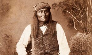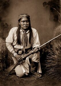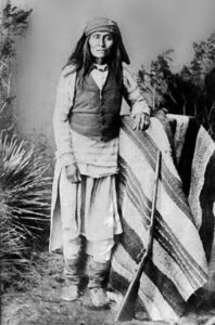 GERONIMO (1829? – 1909). Curandeiro e líder da subtribo Chiricahua do Sul, chamado de Goyakla (“Aquele que boceja”) pelos apaches, nasceu e cresceu em algum lugar na região ao redor das cabeceiras do Rio Gila. Em 1958 soldados mexicanos atacaram o acampamento apache perto de Janos, no Estado de Chihuaha e mataram sua mãe, esposa e filhos. Depois disso o ódio intenso de Geronimo pelos mexicanos nunca diminuiu. Durante os anos seguintes sua fama como guerreiro cresceu, especialmente no México. Em abril de 1877, em Ojo Caliente, New Mexico ele foi preso pelo agente indígena John Clum e conduzido para San Carlos, Arizona com 110 homens de seu grupo. Geronimo permaneceu pouco notado na reserva até 1881, quando ele e outros apaches fugiram e iniciaram ataques principalmente na Sierra Madre do México, sudeste do Arizona e sudoeste do México. Em 1883 o General George Crook persuadiu-o a se render, embora ele não tenha realmente se entregado até fevereiro de 1884 – e basicamente em seu próprios temos. Ele fugiu de novo da reserva em maio de 1885 e em março de 1886 Crook de novo efetuou uma rendição condicional. A caminho do Fort Bowie, Arizona, o local combinado para a rendição, Geronimo fugiu para as montanhas mais uma vez. Finalmente, em 3 de setembro de 1886 o General Nelson Miles presidiu a rendição final e incondicional de Geronimo. Ele e outros apaches de seu grupo foram enviados para o exílio e prisão na Flórida e cinco anos depois em Fort Sill, Oklahoma. Enquanto o mantinha como prisioneiro, o governo dos Estados Unidos capitalizou sua fama exibindo-o em vários eventos (na Trans-Mississipi and International Exposition de 1898 em Omaha, na Pan American Exposition de 1901 em Buffalo e na St. Louis World´s Fair em 1904) durante os quais Geronimo ganhou dinheiro vendendo fotos de si mesmo e pequenos arcos e flechas com o nome dele. Quando ele faleceu no hospital de Fort Sill, constava da folha de pagamento federal como batedor do exército.