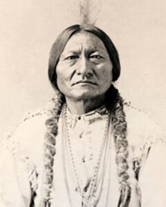 SITTING BULL (circa 1831 – 1890). Chefe e curandeiro da subtribo Hunkpapa dos Teton Sioux. Nasceu perto do Rio Grand no que é hoje Dakota do Sul. Aos quatorze anos de idade ele se distinguiu na luta contra os Crow, adquirindo fama por sua coragem. Somente depois que os Generais Henry Hastings Sibley e Alfred Sully, em 1863 e 1864, marcharam contra os Sioux da subtribo Santee após a Guerra dos Dakotas ou Minnesota Santee Uprising de 1862, foi que Sitting Bull se envolveu em lutas contra os brancos Ele participou de pequenas escaramuças com a força de Sibley no verão 1863 e ajudou a defender o acampamento Teton que Sull atacou com sucesso na Killdeeer Mountain em 28 de julho de 1864. Exatamente um ano depois Sitting Bull liderou um grande grupo de guerra que sitiou o Fort Rice. Em 1866 uma parte dos Teton Sioux, inclusive o líder guerreiro Red Cloud, fez a paz com os Estados Unidos em troca de uma vasta reserva ao redor das Black Hills. Escolhido como chefe de todo os Teton, Sitting Bull, com a ajuda de guerreiros como Crazy Horse, Gall e o velho American Horse (filho do Chefe Smoke e primo de Red Cloud), se esforçou para instilar um espírito de disciplina e unidade entre os Sioux. Em 1874, a descoberta de ouro nas Black Hills um exame de mineradores penetrou na reserva dos Siouxe em 1875 o governo ordenou que toda a tribo fosse para agência perto do White River. Como nenhuma resposta chegasse por parte dos grupos nômades de Sitting Bull, uma campanha militar foi montada contra eles na primavera de 1876. Um grande número de Sioux, Cheyenne e Araphao (alguns estimam cerca de 11 mil) se reuniu com Sitting Bull na proximidade dos rios Rosebud e Little Big Horn para discutir a ameaça branca. Após muito jejum, Sitting Bul teve uma visão de soldados mortos caindo como chuva no acampamento indígena. Logo depois, guerreiros liderados por Crazy Horse derrotaram as tropas do General George Crok na batalha de Rosebud (17 de junho) e em 25 de junho cinco tropas da 7ª Cavalaria comandadas pelo Tenente Coronel George A. Custer foram aniquiladas em Little Big Horn. Sitting Bull não participou destas batalhas. Ele ficou jejuando e rezando como era adequado para a sua posição e teve uma visão de soldados no acampamento indígena. Depois das batalhas e da retaliação subsequente ele e um grupo de seguidores partiu para o Canadá, porém o governo canadense não quís se responsabilizar por eles. Confrontados com a fome, eles voltaram para os Estados Unidos e Sitting Bull se rendeu em 19 de julho de 1881 no Fort Buford. Ele ficou confinado em uma reserva, mas em 1885 viajou com o Buffalo Bill´s Wild West Show. Suportando com dignidade o que deve ter sido uma experiência um tanto humilhante.