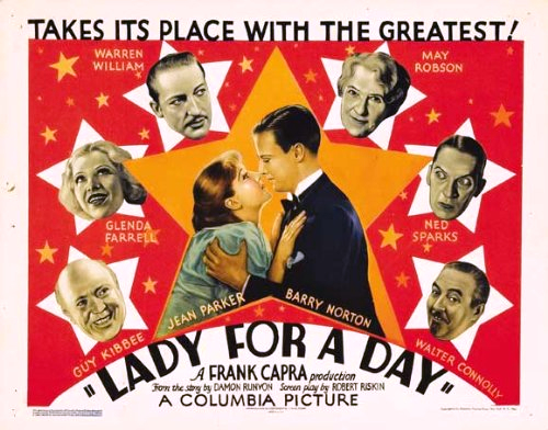 Dama por um Dia. Conto de fadas moderno de Damon Runyon no qual Capra colocou alegria e sentimento. Gângster de bom coração e supersticioso (Warren William) ajuda uma velha e pobre vendedora de maçã, Apple Annie (May Robson) a se passar por uma dama da sociedade, quando ela recebe a visita da filha (Jean Parker), criada em um convento pensando que a mãe era rica. Graças à empatia de Capra com o seu tema e o seu contrôle atrás da câmera, o filme foi indicado para o Oscar assim como o diretor, o roteirista Robert Riskin e a atriz May Robson.